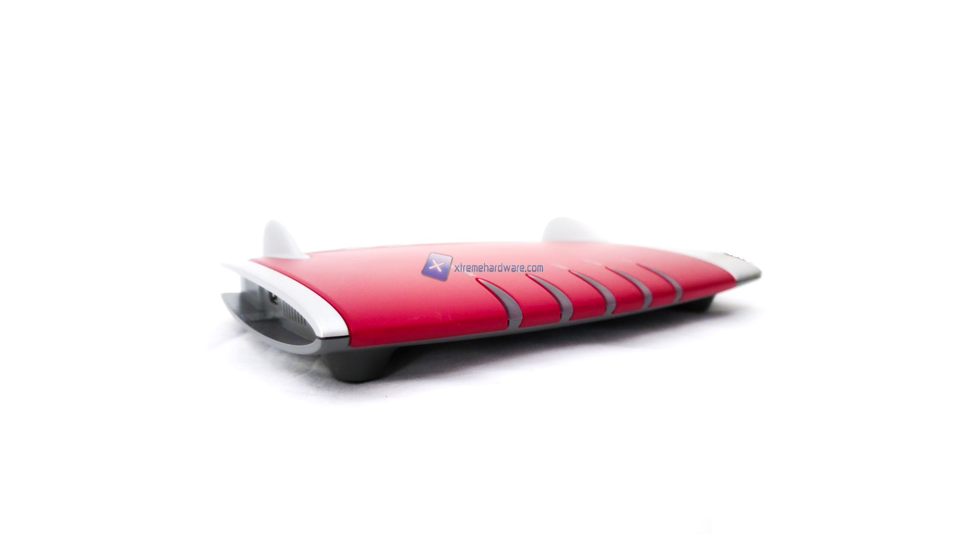 Passiamo ora ad analizzare il prodotto. Come possiamo osservare il design complessivo dei prodotti AVM rimane invariato da prodotto a prodotto, perlomeno quelli relativi al Networking cablato e/o Wireless. Da una parte è un segno che contraddistingue l’azienda dall’altro far pensare a scarsi investimenti in ricerca e sviluppo dei nuovi prodotti, cosa che ovviamente non è riscontrabile per quanto riguarda l’hardware software dei prodotti AVM. Dunque avremo un dispositivo Modem-Router di dimensioni 226 x 47 x 160 mm con un peso questa volta di circa 800g. Anche i colori sono sempre i medesimi e si caratterizzano per la combinazione di grigio e rosso. Lo chassis è sempre in plastica rigida ben rifinita con queste linee che danno modo di pensare ad una navicella spaziali grazie alle due ‘’pinne’’ laterali.