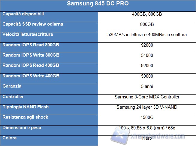 Il Samsung 845 DC PRO è disponibile solamente in due tagli di capacità, infatti abbiamo il più piccolo da 400 GB, che si differenzia dal modello con capacità maggiore oltre che per questo aspetto anche per le minori prestazioni, mentre il più grande è da ben 800GB, che assicura prestazioni maggiori, molto importanti per mantenere una Quality of Service elevata nell’utilizzo nei Data Center, soprattutto grazie a una bassa latenza tra le operazioni. Come possiamo vedere Samsung per questa serie non ha molti tagli di capacità disponibili, soprattutto perché il prodotto è indirizzato alle aziende. Come abbiamo detto le prestazioni di questa serie di SSD variano a seconda della capacità dello stesso; abbiamo posto nella tabella le prestazioni dei nostri SSD in modo da rendervi chiara la differenza di prestazioni:
