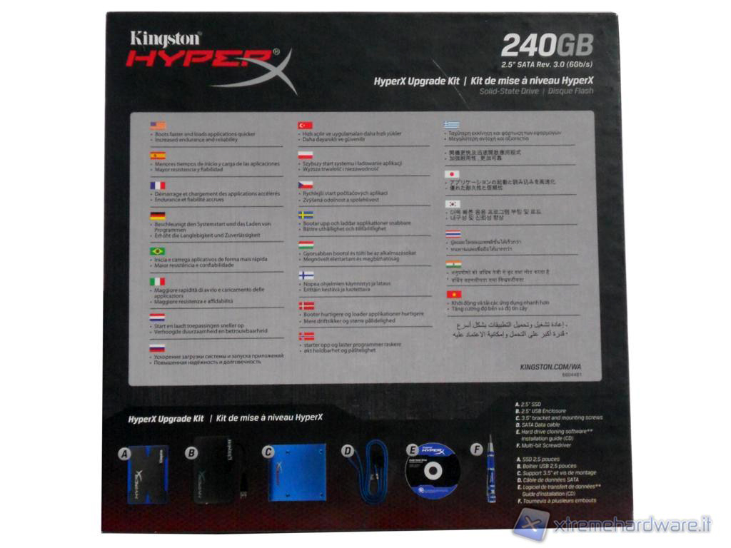 Lungo i bordi della scatola troviamo informazioni dettagliate e corredate da immagini riguardanti le prestazioni del disco così come nella parte bassa dove inoltre è presente la lista completa del bundle. Le informazioni riportate nella parte bassa sono disponibili in molte lingue, tra cui anche l'italiano.