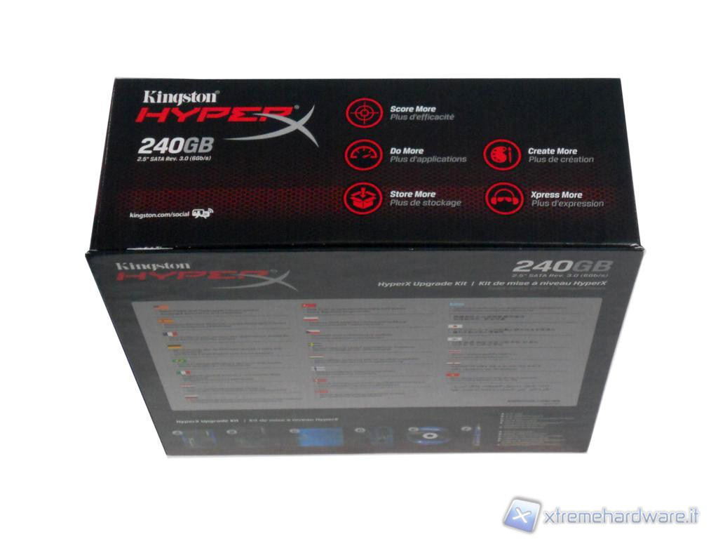 Il Kingston HyperX Upgrade Kit viene venduto all'interno di una confezione di cartone dalle dimensioni di 155 X 155 X 60 mm, dimensioni abbastanza generose se si pensa ad un SSD, l'impatto visivo è ottimo, tutte le facciate sono molto particolareggiate. Nella parte alta troviamo uno sfondo nero con una stampa effetto pelle consumata e dettagli rossi tra i quali risalta il volto/logo Kingston, al centro vi è invece una foto del drive in rilievo e lucida mentre in alto troviamo la scritta Kingston HyperX seguita poco più sotto dalla capacità del modello e dalla versione ovvero HyperX Upgrade Kit, in alto a destra invece vi sono le performance dichiarate dalla casa madre, quest'ultime sono più basse rispetto a quelle scritte in precedenza, probabilmente perché quella messa in commercio è una revisione aggiornata.