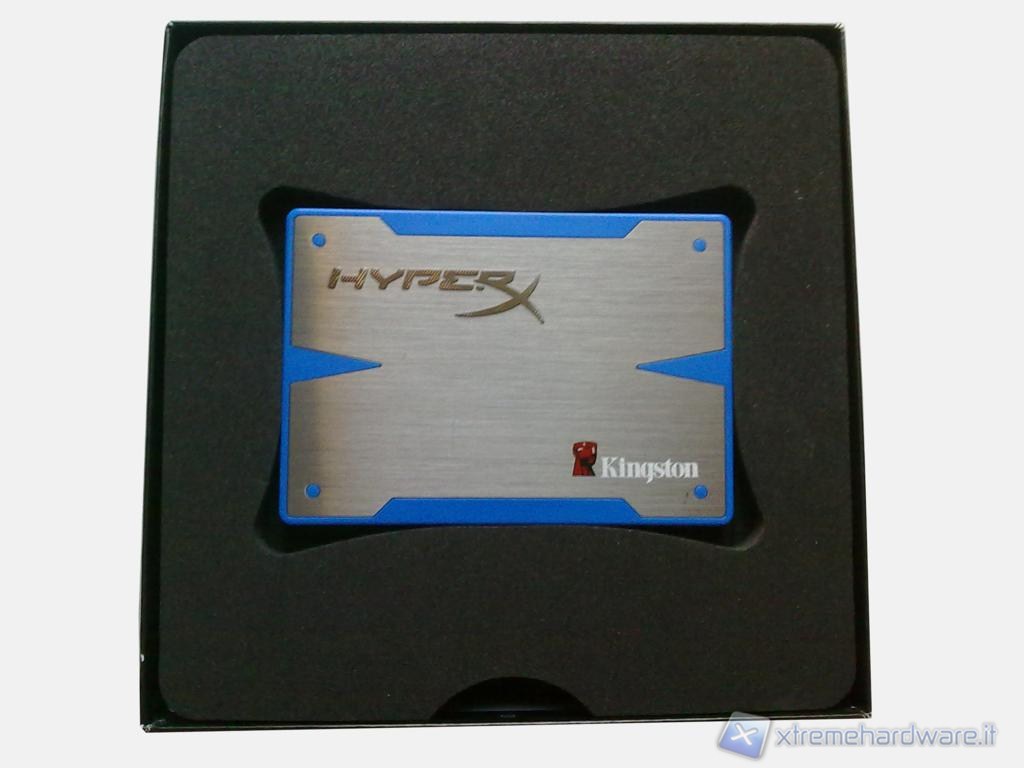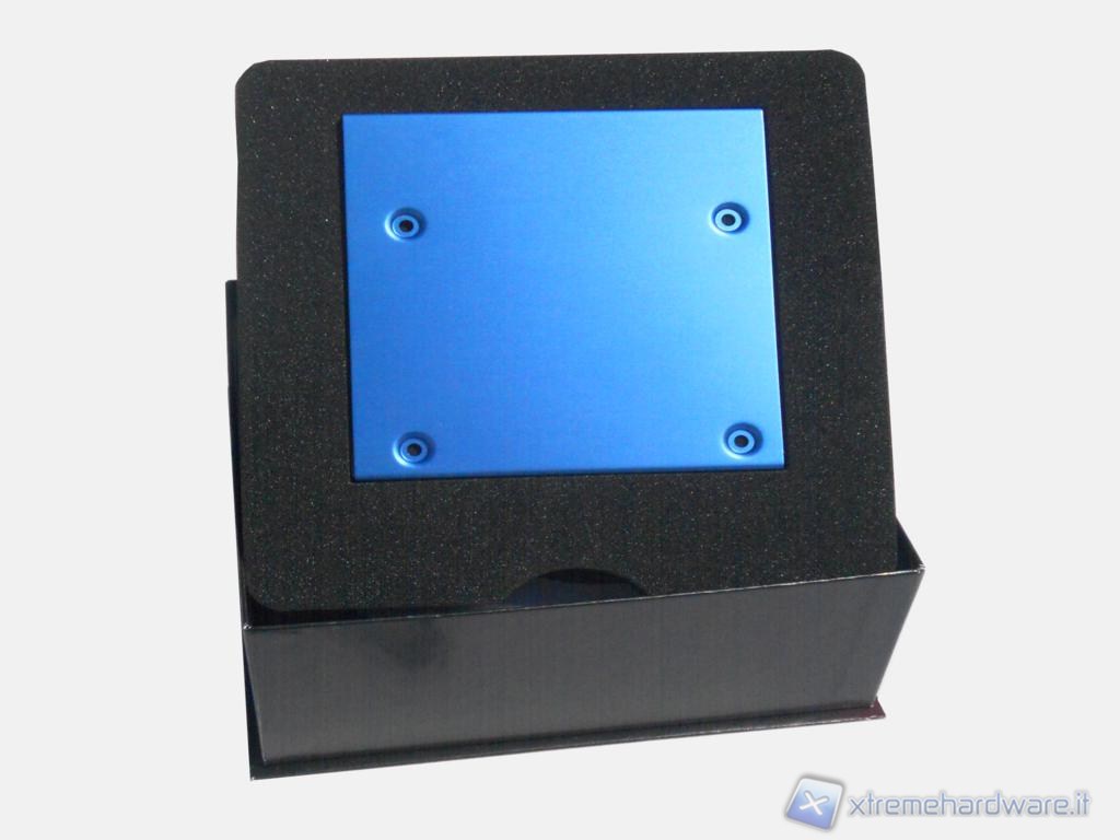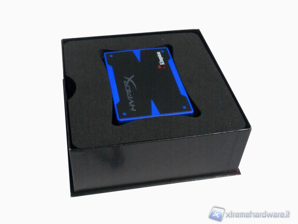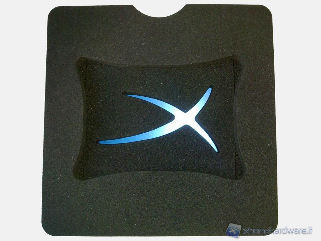 La scatola ha un'apertura particolare, la parte superiore funge da coperchio insieme ai laterali e va rimossa sfilandola dalla parte inferiore. Una volta aperta la confezione troviamo subito il drive incastonato al centro di un materiale spugnoso di colore scuro. Rimosso il drive s'intravede la X stilizzata, logo della serie, blu anodizzata di materiale metallico, quest'ultimo è il supporto del drive da 3,5", ruotando la prima lastra spugnosa infatti si potrà rimuovere il supporto e le viti per il montaggio nascoste sotto di esso. Normalmente la dotazione di un SSD si ferma qui ma non in questo caso.