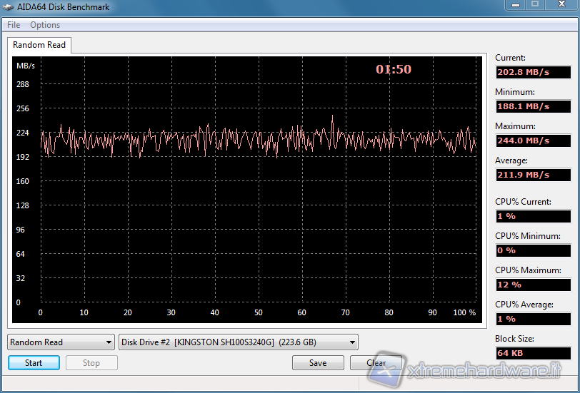 Il sistema di prova utilizzato per testare il drive Kingston è basato su chipset Intel P67, la scheda madre, una Asus P8P67 Deluxe step B3, è esente quindi dal problema rilevato al chip SATA II nello step precedente (subito ritirato dal mercato), nonostante la velocità della connessione SATA II sia limitata a 3 Gbit/s dichiarati (384 MB/s) abbiamo effettuato anche i test utilizzando tale connessione in quanto le periferiche SATA III sono completamente retro-compatibili. Inoltre, dato il box in dotazione, abbiamo effettuato i test collegando il drive attraverso la USB 2.0 anche se la banda passante di 480 Mbit/s (60 MB/s) è molto limitata per un SSD SATA III 6Gb/s.