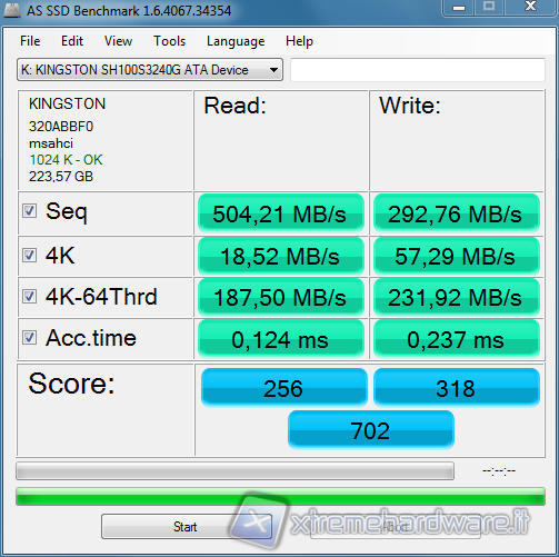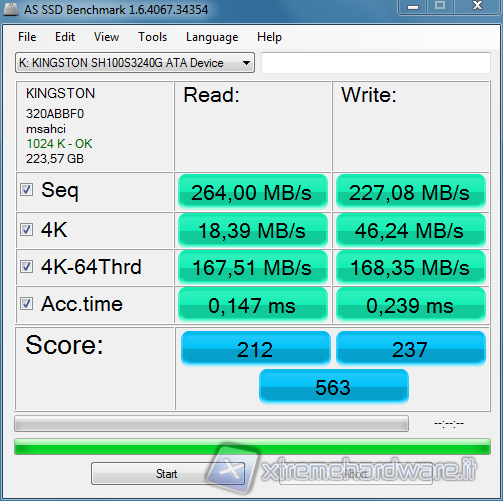 Finalmente il drive Kingston dà il meglio di se, 528MB/s in scrittura e 560 MB/s in lettura sono fino ad ora i risultati più alti da noi riscontrati e al di sopra della media. Le elevate prestazioni in scrittura colpiscono maggiormente ma in generale i risultati sono eccezionali.