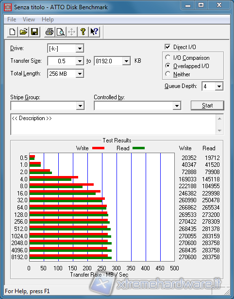 Atto è un benchmark gratuito che esegue dei semplici test in lettura e in scrittura in modalità sequenziale adoperando una Queue Depth (file in coda) di 4.