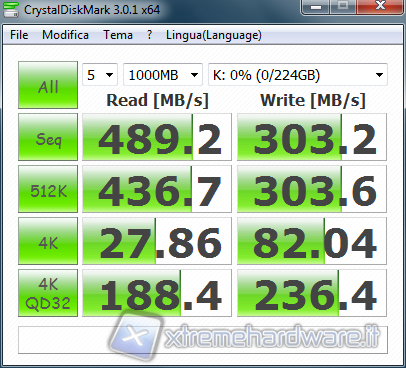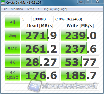Le prestazioni riscontrate sono ottime per tutti i test che il programma permette di eseguire, l'unico neo risiede nelle prestazioni 4K in scrittura che tuttavia non è assolutamente allarmante: