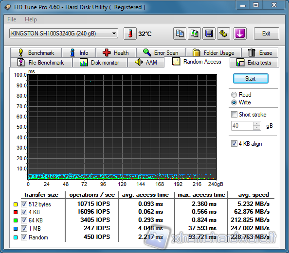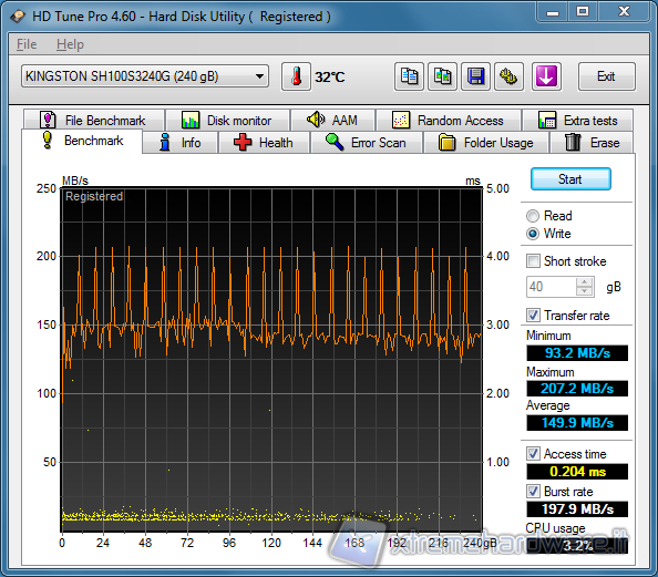 HD Tune è un utility per Hard disks e SSD con molte funzioni, può essere utilizzato per misurare in modo accurato le performance del nostro drive alla ricerca di errori in quanto permette anche di monitorare lo stato vitale del drive, inoltre permette di cancellare dati in modo sicuro e molto altro ancora. La versione da noi utilizzata è l'ultima disponibile al momento e si tratta della 4.60. Il programma è disponibile in due versioni, una freeware (HD Tune) e una a pagamento (HD Tune PRO), nel nostro caso è stato necessario utilizzare la versione PRO in quanto è l'unica a misurare le prestazioni del drive in scrittura. Nonostante il drive in nostro possesso fosse completamente vuoto il software, prima di effettuare test in scrittura, avvisa dell'imminente perdita dei dati e chiede una conferma all'utente per proseguire.